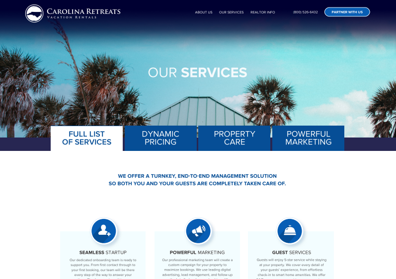 The client, a vacation rental and management company, had begun to expand their business into more key locations along the east coast. To attract more business on the management side, the client approached us with the project of creating a microsite to attract vacation rental homeowners. Their previous website had a single page dedicated to owners, and the client expressed a desire to have a microsite which would be able to elaborate on the strengths of their management services which could function separately from the rental site. This included creating new copy, graphics, and a website, which all needed to feel like its own distinct portal of information without straying too far from the already established branding of the rental website.